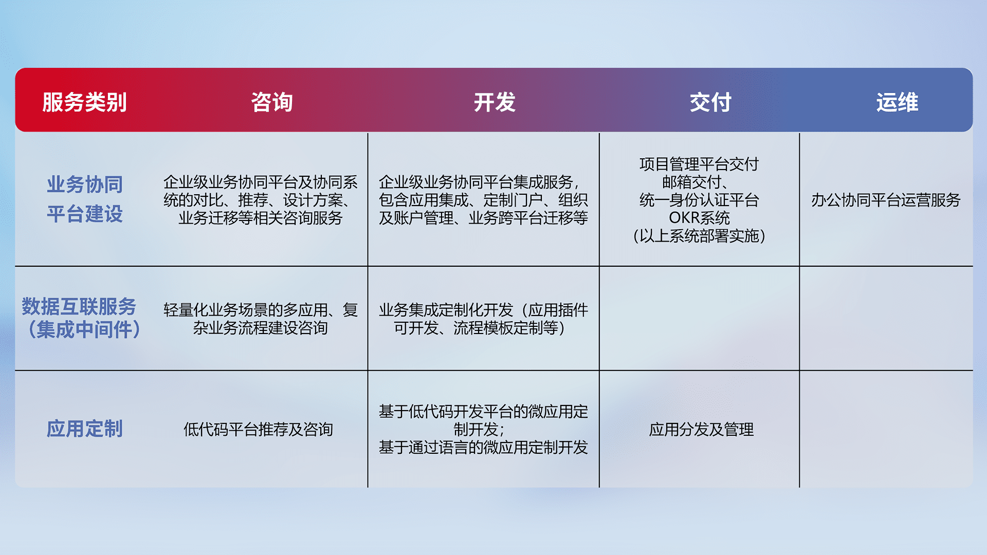 针对钉钉、、、、企微、、、IDaas等平台级产品提供产品的规划、、方案、、、交付、、、、定制化开发等服务,,实现如统一协同办公、、、智能客户服务、、、混合会议管理、、智能数据查询、、、、等业务场景,,,,实现数字化转型。。